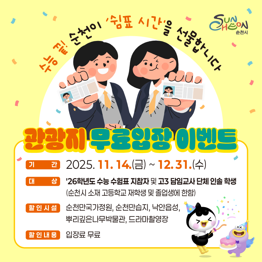 2026학년도 대학수학능력시험 수험생을 위한 관광지 무료입장 안내