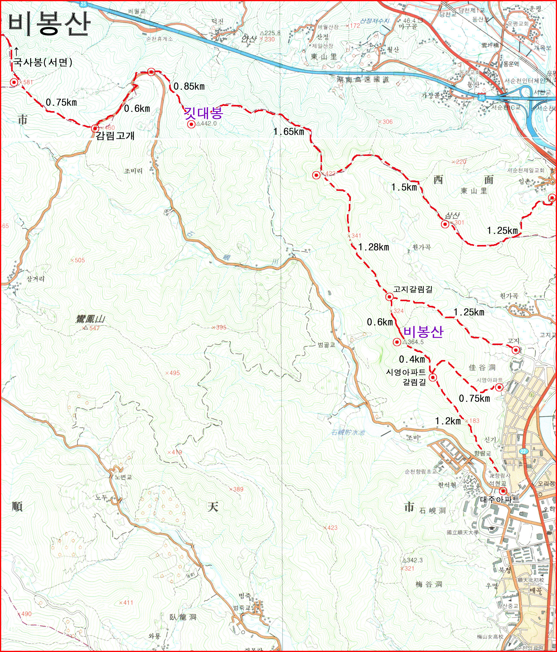- 순천경찰서뒤 대주아파트 - 시영아파트갈림길 - 비봉산 : 1.6km